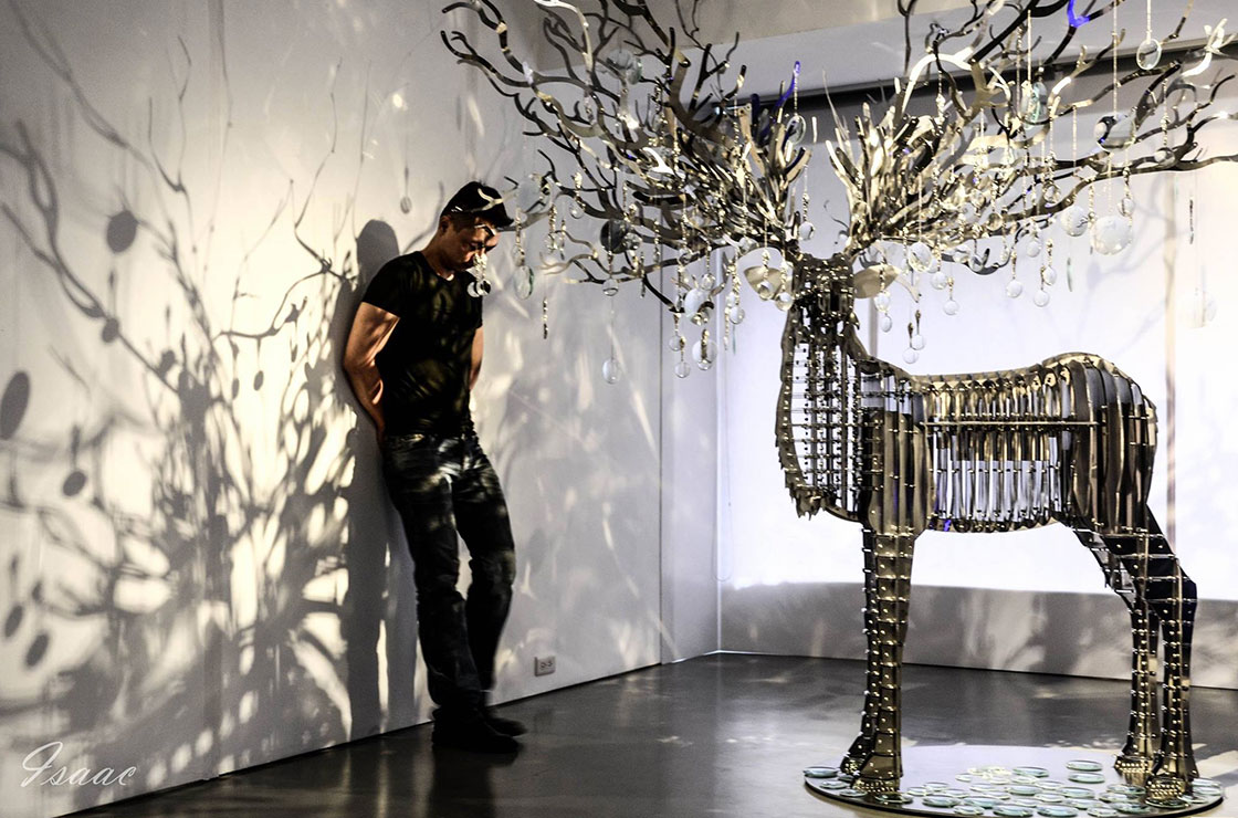 抬頭遠望的鹿,生姿勃發.頭上開枝散葉的鹿角,以不規則且隨機的型塑,希望透過不同場域不同時空的裝置,使作品產生不同的意識.也期望這樣的意識能與觀者串連,意識流產生的鹿角上面,掛著許多放大鏡,希望藉用物體本身的關聯性,串聯起觀者的回憶與夢境.